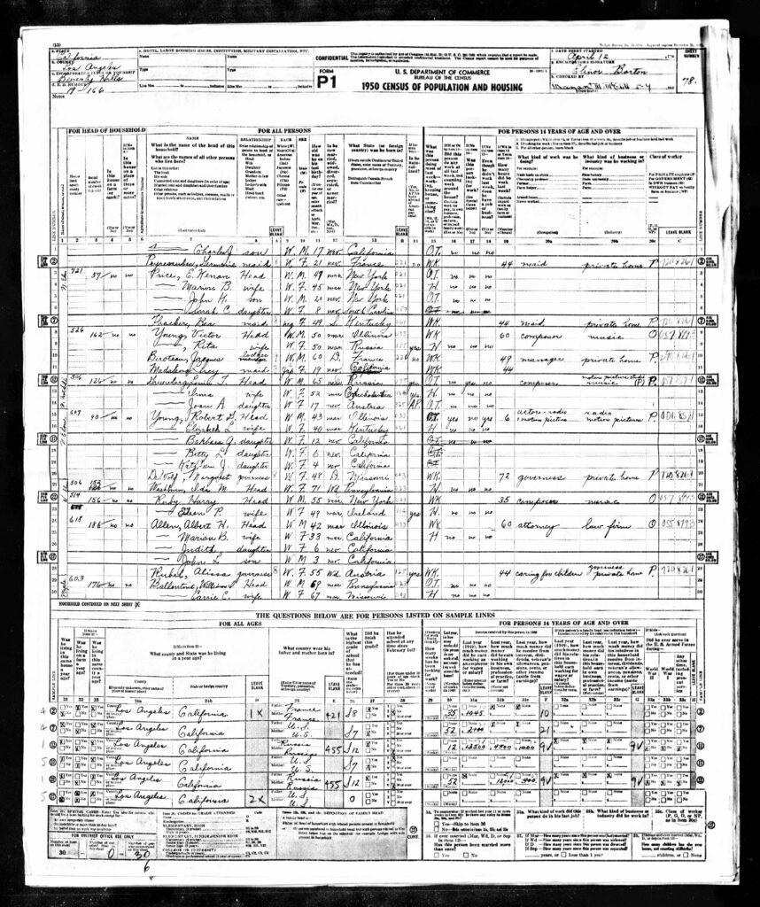 The 1950 Federal Census was released by the National Archives and Records Administration on April 1, 2022, to much fanfare, since these releases occur only once every ten years. Having exhausted the data available in the 1940 census, this researcher eagerly awaited this next issue. Since Victor Young died in 1956, the last census he appeared in was the 1950 enumeration, and this would provide a snapshot of what his Beverly Hills neighborhood was like near to his time of death. Knowing from prior years that Young often had people living with him for long periods of time, here, I anticipated, was an opportunity to find the name of a resident that might have been young at that time, and could still be, perhaps, extant on planet Earth.
