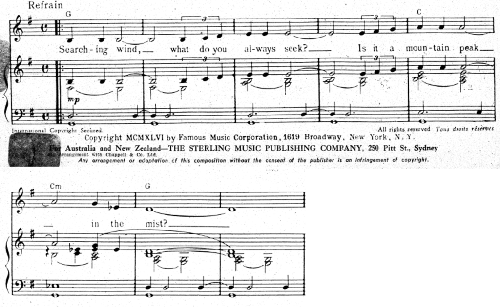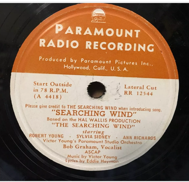 An American, career diplomat, looks back on his mistakes at the end of WW2. Starring Elm St. neighbor Robert Young, with Sylvia Sydney, and Ann Richards, The Searching Wind, produced by Paramount Pictures in 1946, gave inspiration for Victor Young to write a beautiful love theme. This was quickly released with lyrics written by Eddie Heyman. The first eight measures of the Refrain are shown below, but I have omitted the introductory Verse. The YouTube link is to a playlist with three versions of the theme, in which the listener can hear how it was originally composed and orchestrated for the film, and released as a vocal solo performed by Dick Haymes and later as an instrumental featuring a Tommy Dorsey trombone solo, accompanied by Victor Young’s orchestra for Decca. If you are not familiar with the voice and style of Dick Haymes, you are in for a treat. One other vocalist, Bob Graham, is known from a Paramount Radio Recording record label (see below). Interestingly, the ASCAP song registry doesn’t list ANY performers for this song. It seems safe to conclude that this is a relatively unknown Victor Young song, one that I hope will be revived in the future. If you follow the YouTube link and listen to all three versions, please ‘vote’ in the poll of this Newsletter page to indicate which version you prefer. If you have the Bob Graham or other recordings, please send them to me.